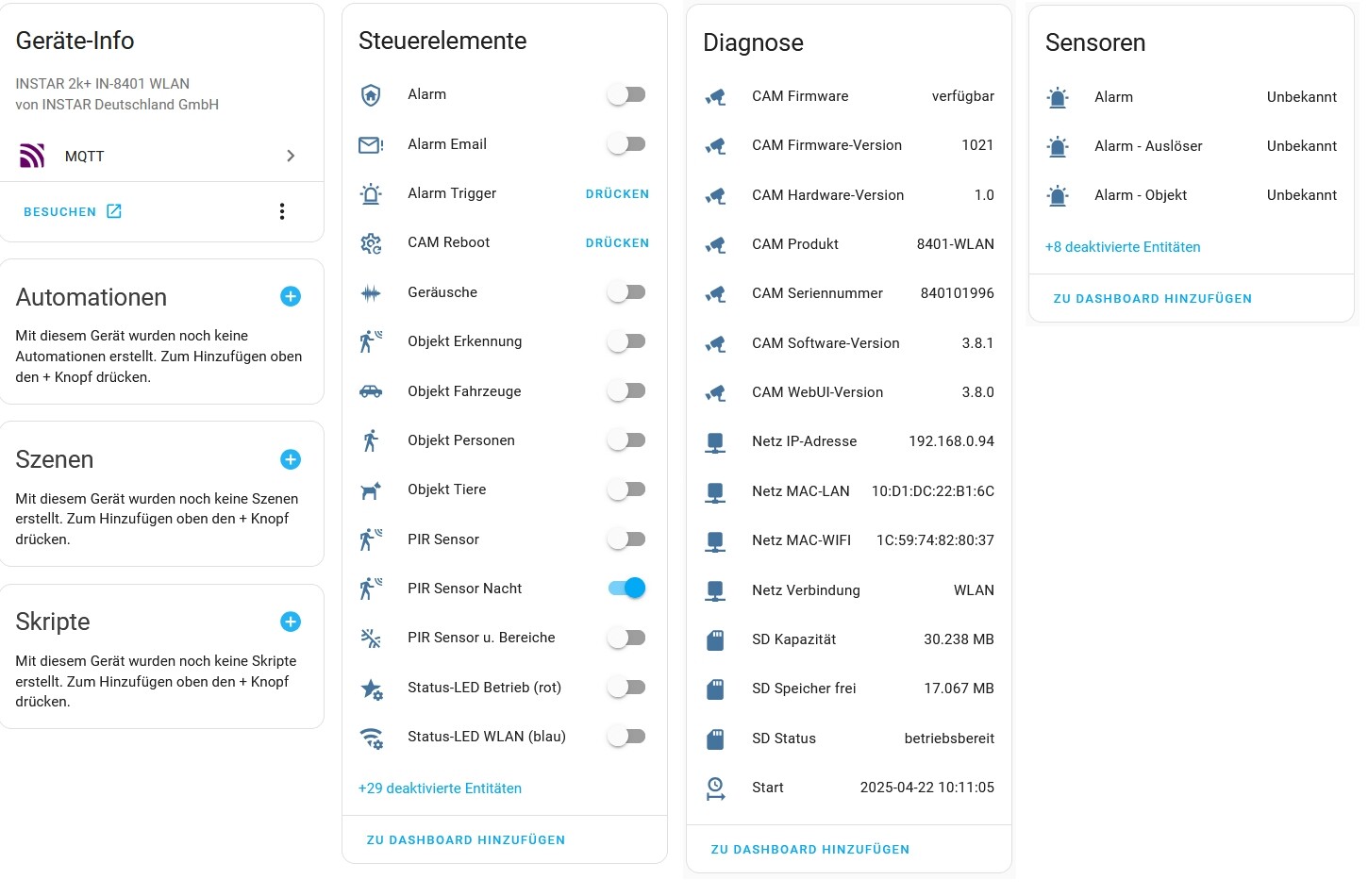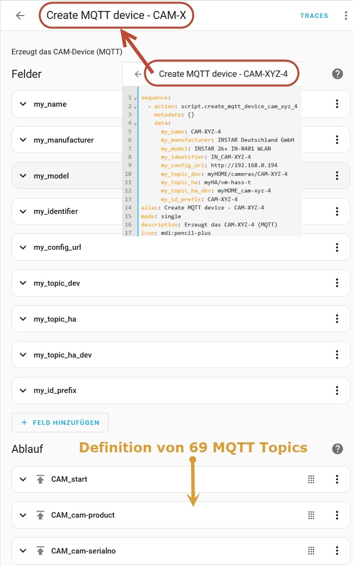 Ich habe mir daher ein zentrales Skript geschrieben, das in der Lage ist, eine INSTAR Kamera (sinnvoll) in HA als Gerät anzulegen: